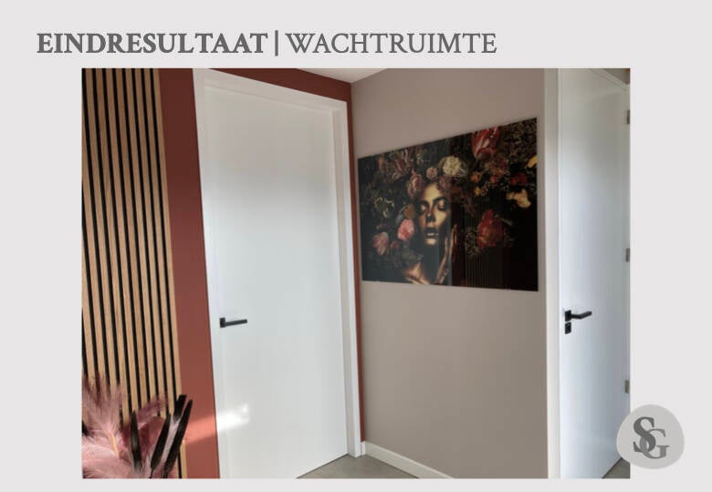 De klant wilde graag kleur in de wachtruimte en rust in de salon. Door het gebruik van deze kleuren in combinatie met de juiste materialen, meubels en accessoires is een fijn sfeertje ontstaan.